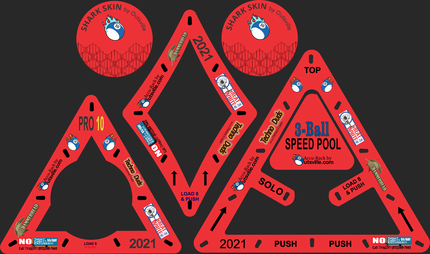 Limited Run CODE RED Full Set of templates Solo, 9 and 10 flat packaged plus a 3ball template and 2 Shark Skin Table Saver Break Circles.